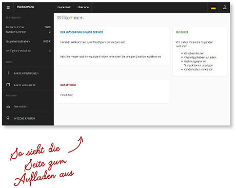 Unter Ihrem privaten Kunden LogIn sehen Sie immer schön übersichtlich die verbleibenden Wäschen und das aktuelle Guthaben. Außerdem können Sie bequem Ihr Guthaben auf der Seite aufladen.